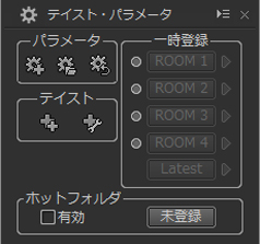 テイストの登録の場合もこのダイアログが表示されます。編集中のファイルの種類、ボタンを押した場所のテイストの種類が選択された状態で、編集可能なテイストに追加された状態で表示されます。テイストの名前を変更、表示位置を決定して OK ボタンを押すとテイストの登録が完了します。 4.1.2. テイスト・パラメータ 「テイスト・パラメータ」サブコントロールではテイストの登録と編集、現像パラメータの保存、読み込み、初期化、一時登録をおこなうことができます。 4.1.2.1. 一時登録 「一時登録」は現像パラメータを一時的に記録する機能です。 4.1.2.2. ホットフォルダ 現像パラメータを記録しておくことができる部屋は4つあり(ROOM1~4)、もう1つ"Latest"と記された特別な部屋があります。 最初の4つの部屋は、任意の現像パラメータを記録することができます。 左側の○ボタンをクリックすることで、現在選択されているコマの現像パラメータが部屋に記録されます。 部屋に現像パラメータが記録されると、記録された時刻が表示されます。 現像パラメータが記録されている部屋はボタンになっており、このボタンをクリックすると、現在選択されているコマに部屋に記録されていた現像パラメータを貼り付けます。 こうして、他のコマの現像パラメータや、同じコマの過去の現像パラメータなどをコピーすることができます。 現在選択されているコマの現像パラメータと一致する現像パラメータが記録されている部屋は強調表示されます。 右側の アイコンは、「連続コピーモード」に入るためのボタンです。 「連続コピーモード」とは、部屋に記録された現像パラメータを複数のコマに貼り付けていくモードで、サムネイル表示上で現像パラメータを貼り付けたいコマの上でクリックしていきます。このモードから抜けるためには、再度 アイコンをクリックしてください。一番下に配置された特別な部屋"Latest"は、常に最後に編集された現像パラメータが格納されています。 現像パラメータを調整した最終結果を、他のコマに貼り付けたい場合に活用してください。 「一時登録」にはいくつかの便利な活用方法があります。 詳しくは、「6.5. 一時登録機能の活用」をご参照ください。 「ホットフォルダ」は、選択されたフォルダを監視し、処理対象コマが追加された場合にサムネイルに自動でコマを追加する機能です。 この機能は、単一のフォルダを選択した場合のみ使用することができます。 「ホットフォルダ」枠内の“未登録”と書かれたボタンをクリックする事で、選択されているコマの現像パラメータが登録され、“有効”のチェックボックスにチェックが付きます。 “有効”にチェックが付いている間、登録された現像パラメータが適用された状態でコマが自動追加されます。 “有効”のチェックは選択フォルダを変更すると自動でチェックが外れます。 4.1.3. コントロール・ボックス コントロール・ボックスには、複数のサブコントロールを配置できます。 メイン・コントロールにあるパラメータカテゴリのサブコントロールは、タブ・ページとしてコントロール・ボックスの上に配置されます。 フローティング・ウィンドウになっているサブコントロールで、タイトル・バーのメニューから"コントロール・ボックスに配置する"を選択した場合、コントロール・ボックスに追加されます。 追加されたサブコントロールは、パラメータ・コントロールのアイコンやメニューから選択されると、コントロール・ボックスがスクロールされ、選択されたサブコントロールが表示されます。 4.2. サブコントロール 「サブコントロール」とは、現像パラメータの各カテゴリに用意された、パラメータ調整のためのコントロール・ウィンドウです。 機能別に (A) ~ (F) 、初期配置別に、(1) ~ (4) とタイプを分類できます。 【サブコントロールの一覧】