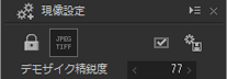 4.8.4. JPEG/TIFF画像を現像対象とする JPEG/TIFF画像を現像処理の対象にするかどうかの設定を切り替えます。 4.8.5. 現像予約 「JPEG/TIFF画像を現像対象とする」ボタンで、または機能設定の「JPEG/TIFF画像を現像対象とする」チェックボックスで設定することができます。 「JPEG/TIFFを現像対象とする」のチェックをはずした状態(ボタンをOFFにした状態)では、SILKYPIXでJPEG/TIFF画像の編集をおこなうことができなくなります。 このモードでは、現像パラメータの調整をおこなうための各コントロールは無効状態となり、操作することができなくなります。 以下のような場合に活用してください。
