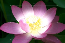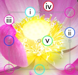 【ハンドルの操作方法】i. 矩形の上下の辺中央のハンドルを上下にドラッグすると、矩形の高さを調整することができます。 ii. 矩形の左右の辺中央のハンドルを左右にドラッグすると、矩形の幅を調整することができます。 iii. 矩形の角のハンドルを四角形の内外にドラッグすると、矩形の大きさを拡縮することができます。 iv. 矩形の上辺の真上に突出しているハンドルをドラッグすると、矩形を回転して、その角度を調整することができます。 なお、このハンドルを[Shift]キーを押しながらドラッグすると、矩形を45度毎に回転をおこなうことができます。 v. 四角形の中央のハンドルをドラッグすると、四角形の位置を移動することができます。