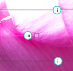 【帯域の操作方法】中央の線上のハンドルにマウスポインタを合わせると、マウスポインタが に切り替わります。帯域が横方向の状態で上下にドラッグをすると、帯域の中心を上下に移動することができます。 帯域が縦方向の状態で左右にドラッグをすると、帯域の中心を左右に移動することができます。 中央の線上のハンドル以外の場所へマウスポインタを合わせると、マウスポインタが に切り替わります。この状態でドラッグをすると、帯域を回転することができます。 中央の線上のハンドル (iii) にマウスポインタをドラッグすると、帯域の位置を移動することができます。