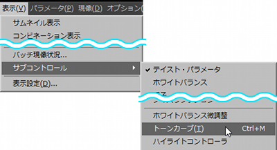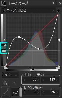 「トーンカーブにグラフを表示する」にチェックを入れることで、ここでの調整状態を、「トーンカーブ」サブコントロールにグラフで表示することができます。 4.5.2.1. 黒レベルツール トーンカーブにグラフを表示した状態で、「調子」のパラメータを調整することで、パラメータの状態を視覚的にグラフで確認することができます。 「トーンカーブ」でさらに微調整をおこなう上でも、「調子」のグラフが表示されていることは参考になります。 指定した点や領域の部分を指定して黒レベルを設定するツールです。メニューの[操作モード(M)]-[黒レベルツール]、もしくはツール・バーの アイコンから黒レベルツール・モードに入ります。選択されたコマに対して、プレビュー画像上またはサムネイル上で、クリックもしくはドラッグにより領域を指定すると、その領域が設定された輝度レベルになるように黒レベルが調整されます。 ここで使用される輝度レベルは、RAWデータ上での感光レベルです。輝度レベルは「機能設定」にて設定できます。詳しくは「9.3.1.3. 黒レベルツールの設定」をご参照ください。 4.5.3. トーンカーブ 「トーンカーブ」は他の補正の調整が終わった上での調子表現の微調整や、効果を与えるための明度変換をおこなうためのツールです。 メニューの[表示(V)]-[サブコントロール]-[トーンカーブ(T)]を選択すると、「トーンカーブ」サブコントロールが表示されます。 サブコントロール・アイコンの「トーンカーブ」ボタンからも表示できます。 「トーンカーブ」の補正は、他の補正処理がおこなわれ、現像設定の出力カラースペースの色空間に変換された後に反映されます。 そのため、例えば、カラーでモノクロを設定した場合にトーンカーブでR、G、B別々に調整を行うとモノクロにならない、現像設定の出力カラースペースを変更した場合は色空間に合わせて再調整が必要になる、等が起こります。ご使用の際はその点を踏まえてご使用ください。 ![]() このサブコントロールでは、明度の変換をおこなうカーブ(=トーンカーブ)を設定します。 横軸が入力(元画像の輝度)、縦軸が出力(変換後の輝度)となっています。 ※「トーンカーブ」サブコントロールのウィンドウ枠をドラッグすると、サブコントロールの大きさを調整することができます。 このとき、[Shift]キーを押さえながらドラッグすると、縦横比を固定して、サブコントロールの大きさを調整することができます。 4.5.3.1. テイストの選択 テイストには、メーカーテイストとして調子に効果を与えるものをいくつか用意してあります。 また、トーンカーブのテイストには、「初期化」、「全て初期化」という特殊な項目があります。 「初期化」は選択されているチャネル(RGBすべて, R, G, B, L のいずれか)のトーンカーブのみを初期化し、「全て初期化」は5つのトーンカーブの全てを初期化します。 4.5.3.2. 構成点の編集 トーンカーブは、構成点を通過するように描かれ、その構成点を操作することでトーンカーブを操作します。 選択されている構成点の情報は、「入力・出力」コントロールに表示されます。 このコントロールで値を編集するか、もしくはトーンカーブ上の構成点をドラッグして、構成点を移動させることができます。