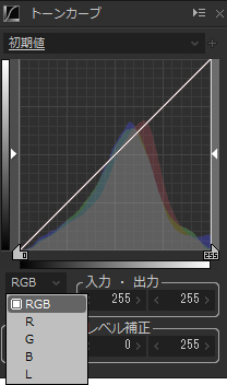 削除したい構成点にマウスカーソルを合わせ、右ボタンをクリックすることで、その構成点が削除されます。 また、[Delete]キーを押すことで、選択されている構成点を削除することもできます。 4.5.3.3. コントロールの説明 (1) チャネル選択 処理対象のチャネルを選択します。 R、G、B、Lのそれぞれトーンカーブでおこなった設定を反映した後に、 RGBのトーンカーブでおこなった設定が反映されます。 b. R R値のみを処理するトーンカーブを編集します。 c. G G値のみを処理するトーンカーブを編集します。 d. B B値のみを処理するトーンカーブを編集します。 e. L ※ 一般的なRGBのチャネルを組み合わせたトーンカーブでは、トーンを変更した際に、明るさと共に色も変化します。 Lトーンカーブでは輝度のみのトーンが調整できるため、例えばハイキ―やハイコントラストにした際でも色の抜けが少なくなり、彩度の変化が少なくなります。