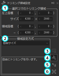 4.13. 効果 メニューから、[表示(V)]-[サブコントロール]-[効果]を選択すると、効果サブコントロールが表示されます。 右下にあるサブコントロール・アイコンの アイコンからも表示できます。![]() 4.13.1. 美肌処理 肌色に近い部分を自動で検出し滑らかに表現することで、肌の荒れや角質などのディティールを抑えることができます。 肌色とそれ以外の境界線部分においても自然で高画質な処理が可能となっております。 4.13.2. ノイズ付加 4.13.1.1. 美肌効果 肌の荒れや角質などを肌色で置き換える効果の強度を調整します。 美肌効果を上げることにより、濃い色の肌のシミが消えやすくなります。ただし、効果を強めれば強めるほど、肌や髪の毛がべた塗りされたような質感になってしまいます。 4.13.1.2. 効果範囲 ただし、効果範囲を大きくすると、細かいシミへの美肌効果が薄くなります。 除去したいシミに合った効果範囲をご利用ください。 4.14. トリミング領域設定 写真に写った画像の一部を切り取った作品をつくる場合に使用します。 トリミング領域の設定は、プレビュー表示の「操作モード」を「トリミング領域設定」に切り替えておこないます。 「トリミング領域設定」の「操作モード」は、「プレビュー表示モード」もしくは「コンビネーション表示モード」のいずれかで、「プレビュー・ウィンドウ」が表示されている状態でのみご使用いただけます。 「操作モード」の切り替えは、メニューから、[操作モード(M)]-[トリミング領域設定]を選択するか、サブコントロール・アイコンの アイコン、あるいは[Ctrl]+[T]キーにておこないます。「操作モード」が「トリミング領域設定」に替わると、「トリミング領域設定」サブコントロールが表示され、プレビュー画像上にはトリミング領域を示す枠線と操作のためのハンドルが表示されます。 ![]() トリミング領域を設定すると、サムネイルにトリミングマークが表示されます。 トリミング領域の設定をおこなう場合、最初に「領域設定方式」によってトリミング領域を設定する方式を決定してください。 トリミング領域は、自由な矩形で設定することも可能ですが、縦横比を固定することによって、出力する目的に応じたトリミングをおこなうことができます。 トリミング領域の設定は、「プレビュー表示」上に表示されるハンドルをマウス操作で調整していただく方法、「トリミング領域設定」サブコントロールでパラメータを調整していただく方法、そして「トリミングツール」による指定の3つの方法があります。 トリミング領域は、各コマに設定していただけますが、「領域設定方式」はソフトウェアの設定として各コマに共通です。 4.14.1. トリミング領域のハンドルの操作方法 プレビュー画像上に表示されるハンドルをマウス操作することで、トリミング領域の設定がおこなえます。 4.14.2. 「トリミング領域設定」サブコントロールの操作方法