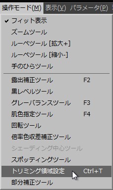 アイコンをクリックするとトリミングツール・モードに切り替わります。トリミングツールは、プレビュー画像上でマウスのドラッグ操作することによってトリミング領域を設定するツールです。 ドラッグの開始点から終了点までの矩形を「領域設定方式」に従ってトリミング領域として設定します。 「領域設定方式」で「自由サイズ」を選択されている場合には、ドラッグの開始点から終了点までの矩形がそのままトリミング領域となります。 それ以外の設定が選択されていている場合には、トリミング領域の縦横比が固定されます。 ドラッグ中のマウスの位置から自動的にトリミング領域の矩形を計算して表示します。 RAWデータには、通常の現像処理で写真として現像処理している領域よりも少し広い領域の情報が記録されている場合があります。 この領域を拡張領域と呼ぶことにします。 4.14.5. カメラで縦横比(アスペクト)を設定したRAWデータについて また、「回転・デジタルシフト」や、「レンズ収差補正」の「ディストーション」によって生じる余白領域も拡張領域に含まれます。 「トリミング拡張」を有効にすると、この拡張領域まで含めてトリミング領域の設定をおこなうことができるようになります。 拡張領域の広さはデジタルカメラの機種によってさまざまです。 また、機種によっては露光せずに真っ黒に写っている領域や、電子ノイズのような無効な画像が記録されている場合もあります。 パラメータで編集された結果生じる余白領域は、グレーに処理されます。 ご利用のカメラで縦横比(アスペクト)を設定して撮影すると、その縦横比(アスペクト)に合わせてRAWデータに記録される領域が変化する機種もありますが、カメラによっては設定した縦横比(アスペクト)よりも広い領域がRAWデータに記録されていることがあります。 この様なRAWデータに対しては、以下のいずれかの方法で設定した縦横比(アスペクト)を現像処理後の画像に反映する場合があります。