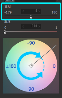 ホワイトバランスターゲットの右方向から時計回りの角度を表し、スライダー移動することで詳細に角度を設定することができます。 設定値により次の場所を指定します。