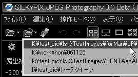 正常にJPEG ファイルが読み込まれると、設定されたパラメータに応じて現像された結果がプレビュー表示されます。【ファイル履歴機能に関して】 ![]() 過去に、ファイルを開くで開いたファイルは、本ソフトウェアによって記憶され、以降、同じファイルを開く場合には、 の横にある三角形の部分 をクリックすることで過去に開いたファイルの履歴から指定することができます。2.2 フォルダを開く 「フォルダを開く」は、フォルダ単位で処理対象のJPEG ファイルを読み込む機能です。[ファイル(F)]-[フォルダを開く(D)]を選択するか、[フォルダ開くアイコン] をクリックして、JPEG ファイルが存在するフォルダを指定してください。2.2.1 サブフォルダの指定 「処理対象フォルダの選択」ダイアログの「処理対象画像の検索先を指定」オプションで、指定したフォルダの下にあるサブフォルダ内のJPEG ファイルを処理対象とするかどうか設定することができます。